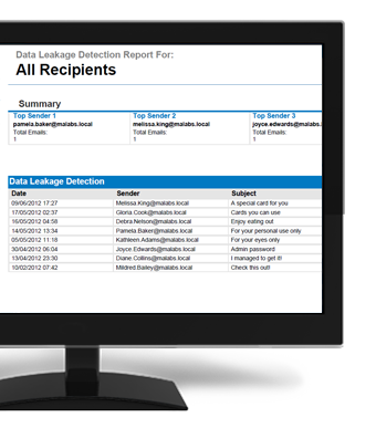 Concerned about people sharing sensitive personal and company information via email? The Data Leakage Detection Report helps you identify emails containing sensitive information, including social security numbers, credit cards and other sensitive information that could put you at legal or financial risk.