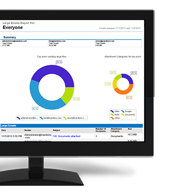 The Large Emails report allows administrators to detect and manage the number of large files being sent by email. This report can be helpful in identifying users who are putting stress on your email infrastructure and also identify what kind of files they are sent.