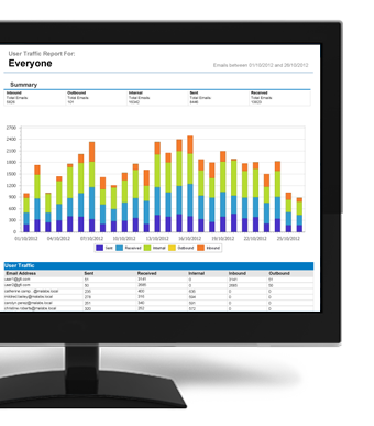 Who is sending and receiving the most email? Where is it all coming from? Whether it’s from internal spammers, or external customers, the User Traffic Report allows companies to determine the number of emails sent or received, internally or from outside the company. The report provides companies with deeper insight into their email flow and helps managers make decisions and identify issues, based on real data in email trends.