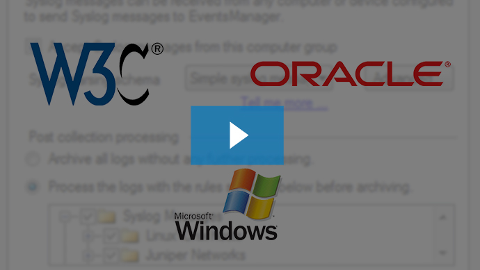 Analysis of log data, including SNMP traps, Windows® event logs, W3C logs, text-based logs, Syslog, SQL Server® and Oracle® audit logs.